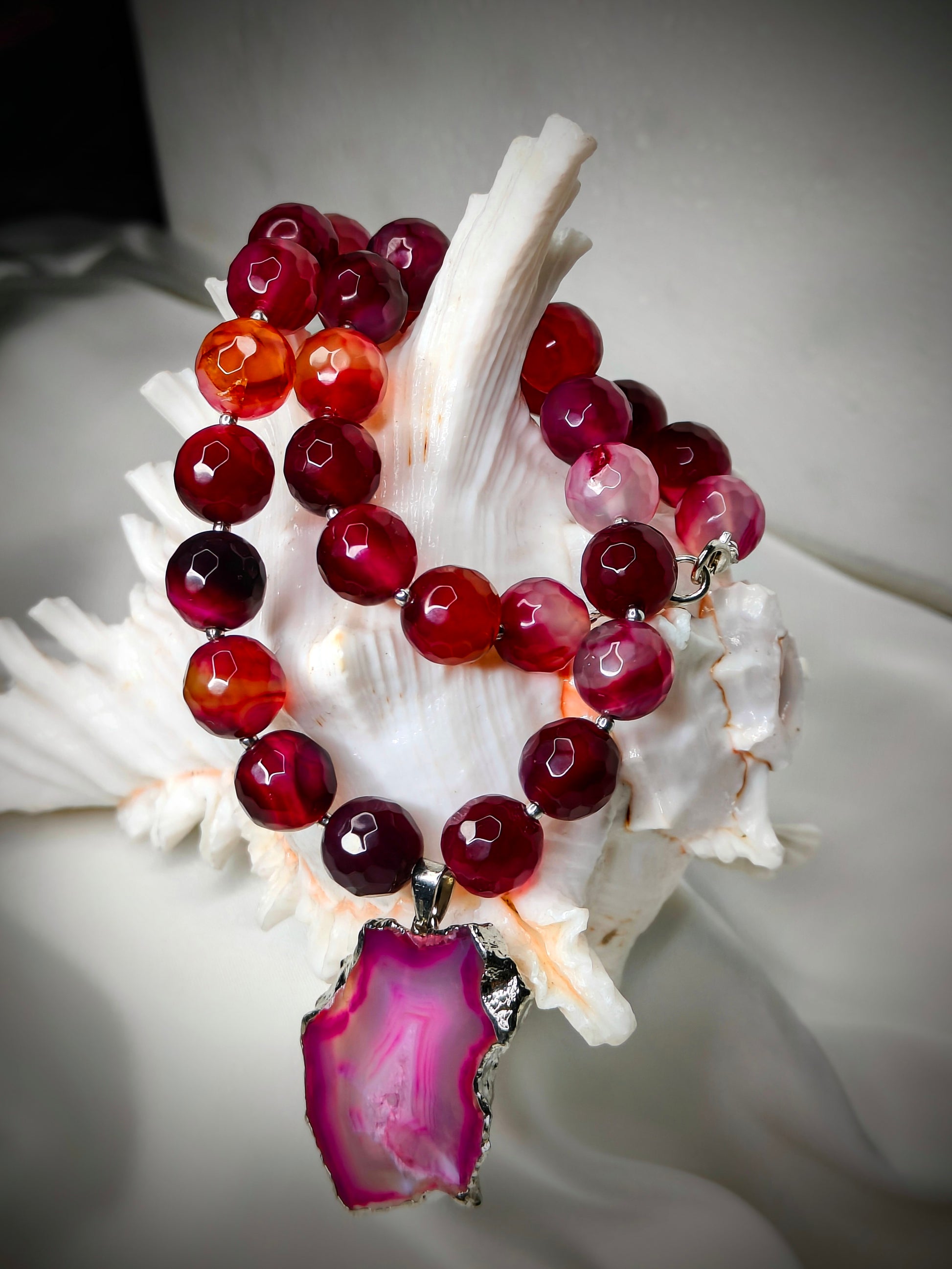 Description: Powerful pink natural agate necklace with pink and silver druzy pendant.