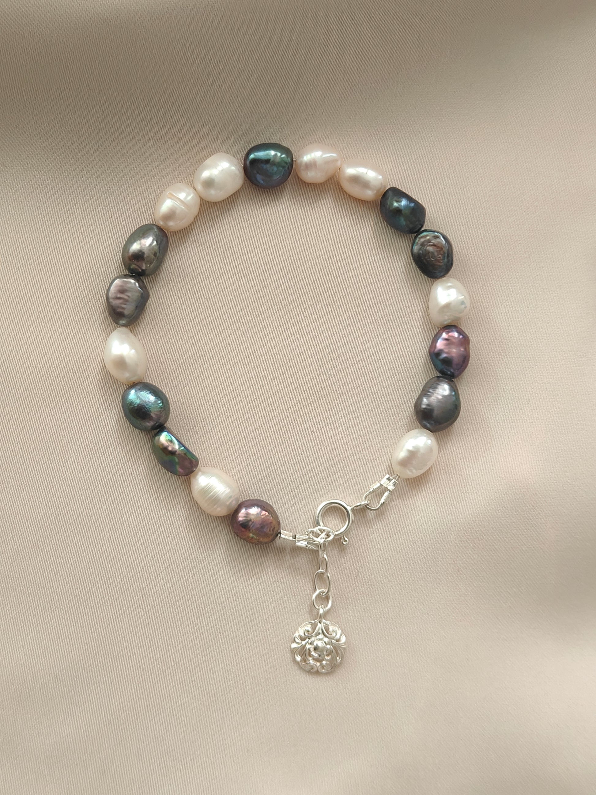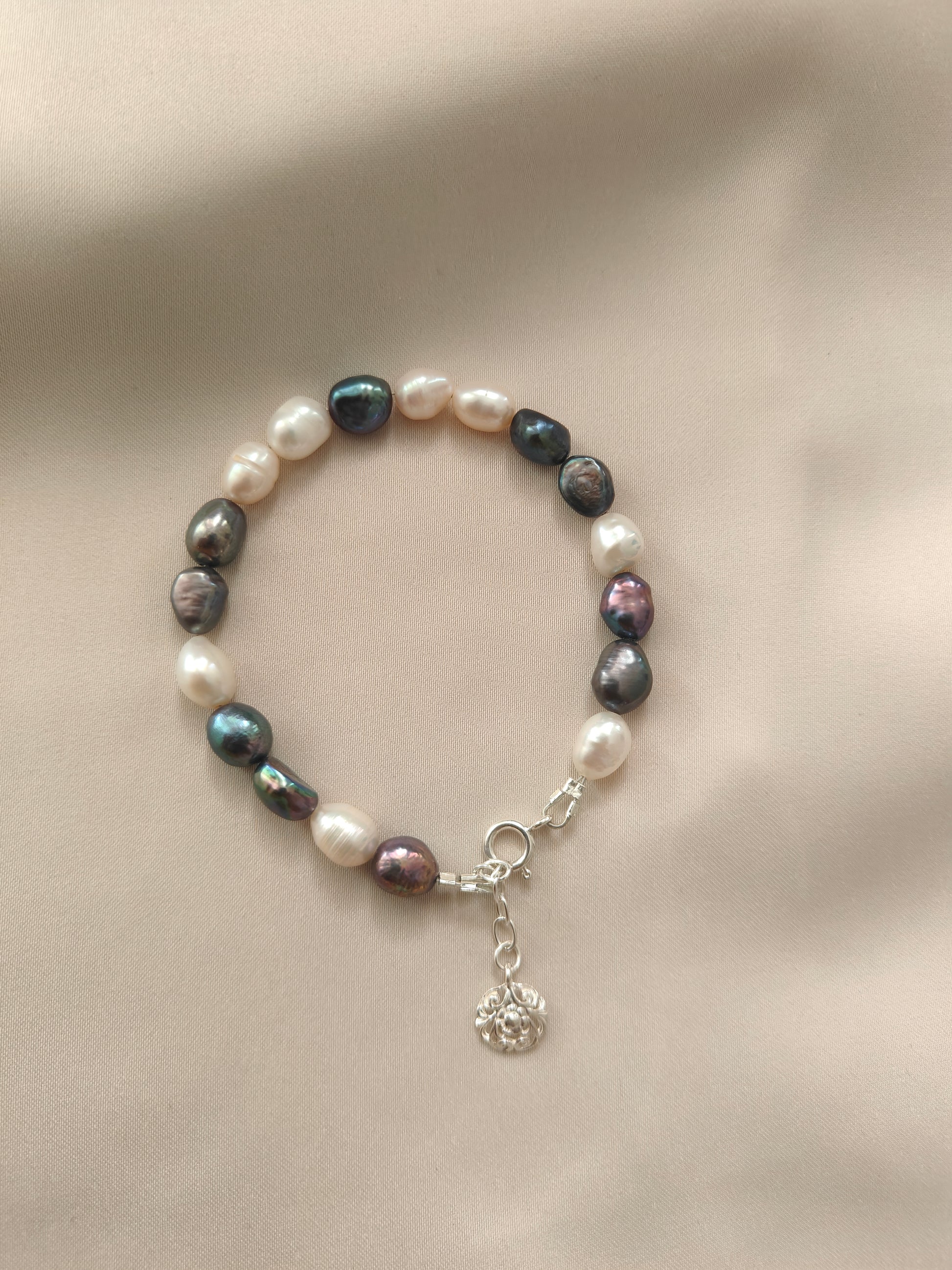 BRPFW001 White and peacock pearl bracelet with filigree charm in sterling silver