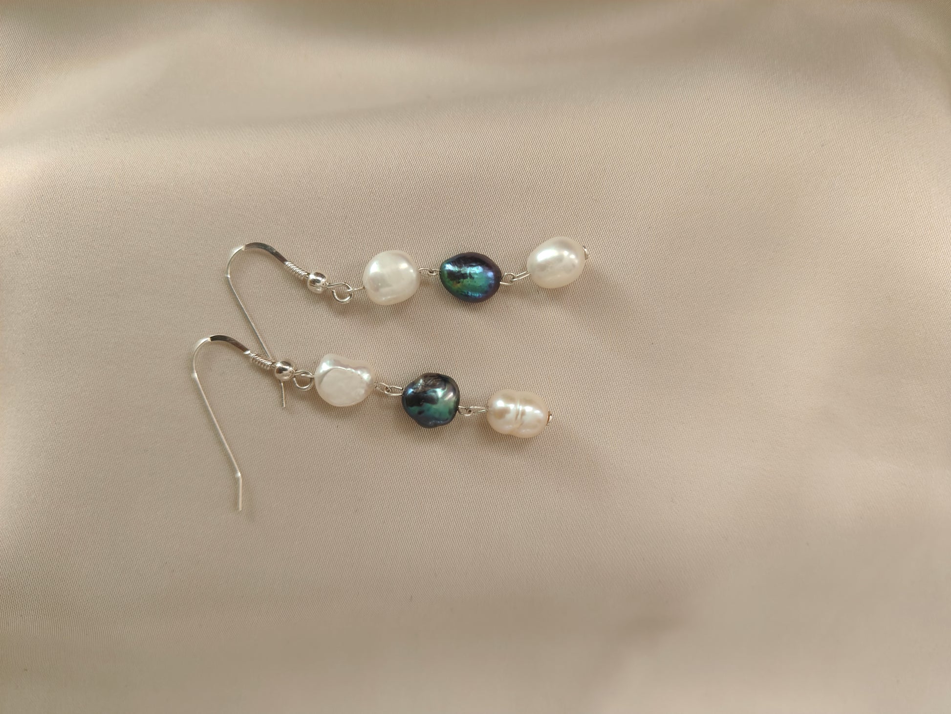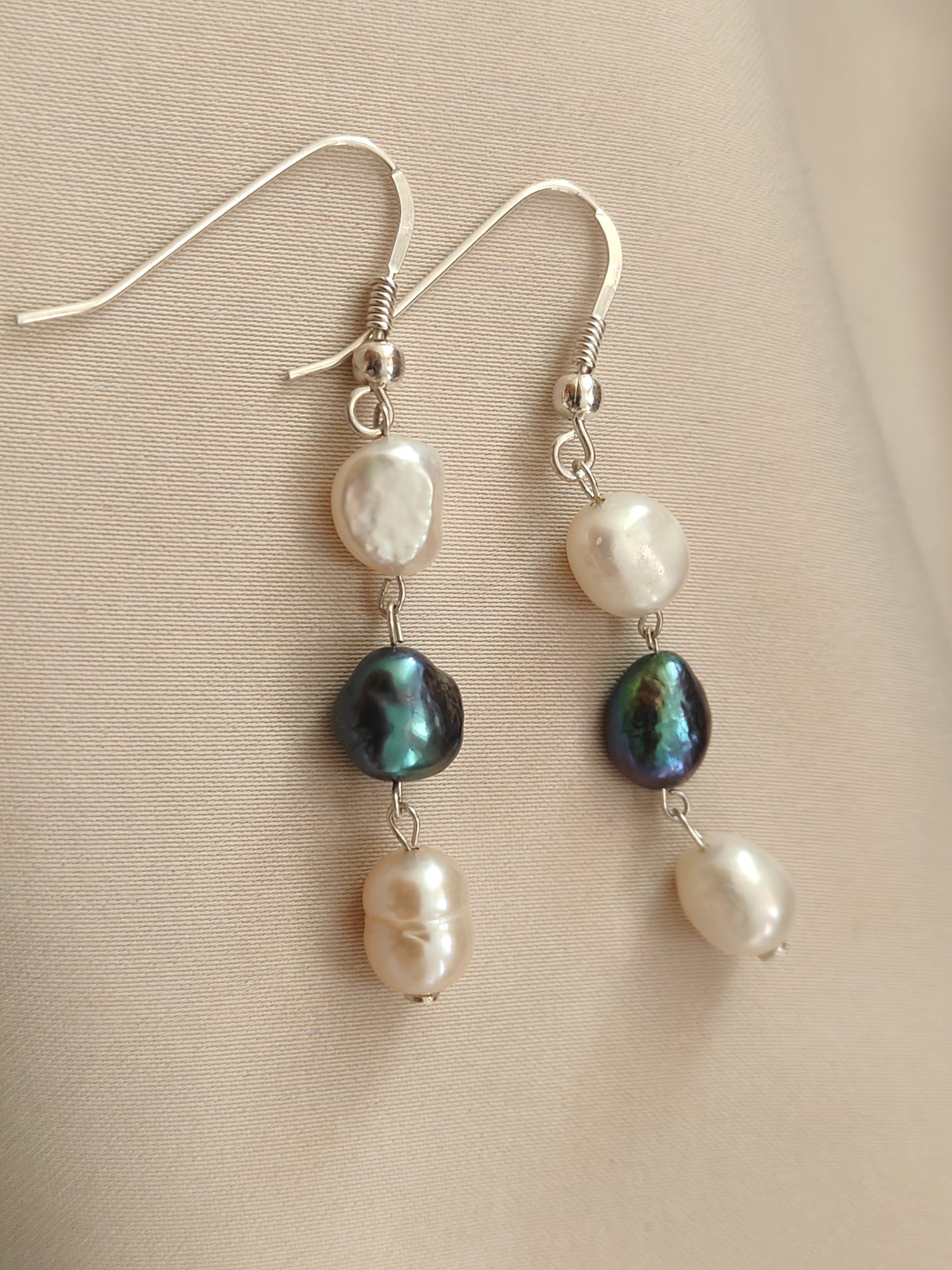 ERPFW016 Organic Luxe- white and dark peacock pearl dangle Earrings with sterling silver