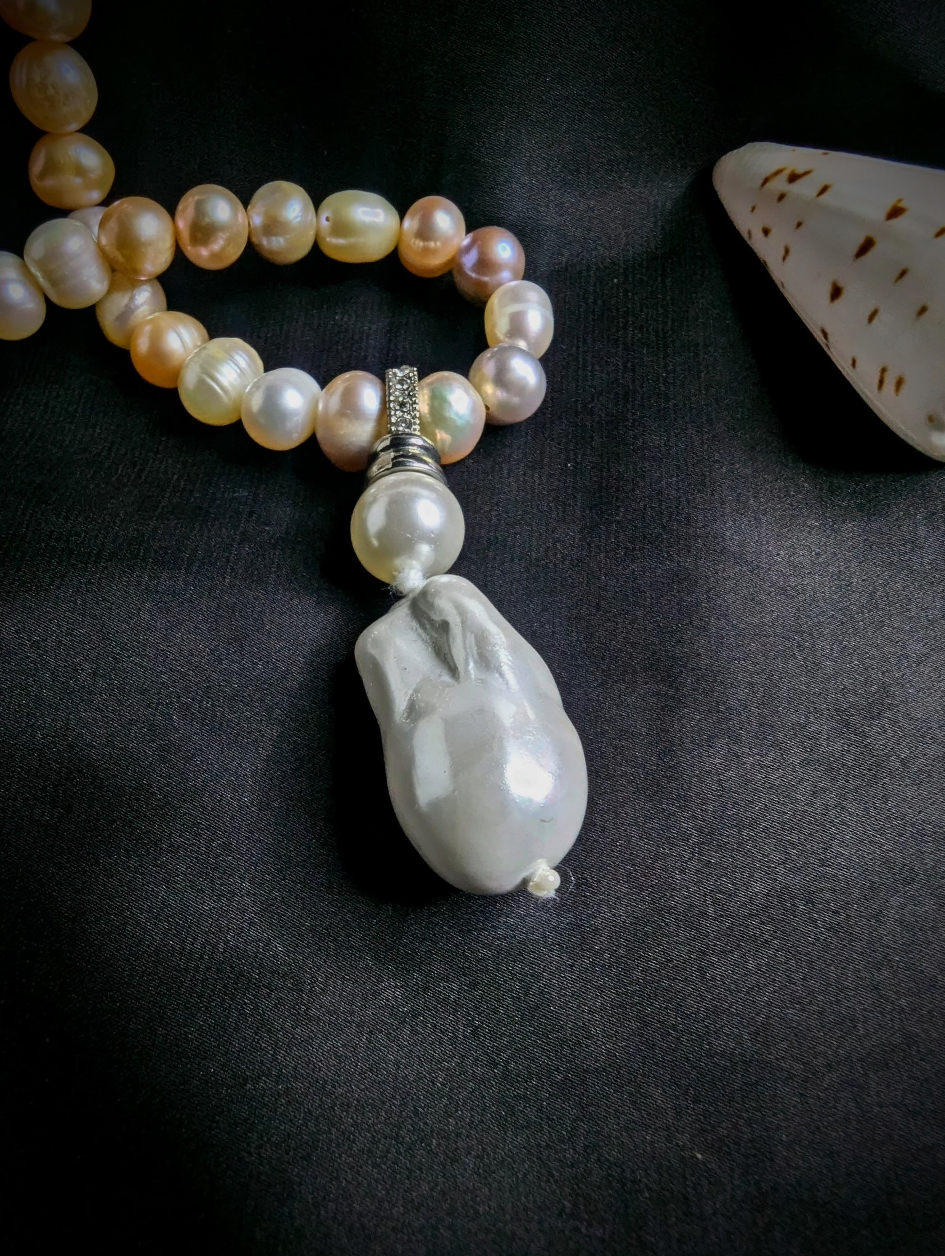 Classic multicolour pearl necklace with baroque pearl pendant featuring beautiful pearls.