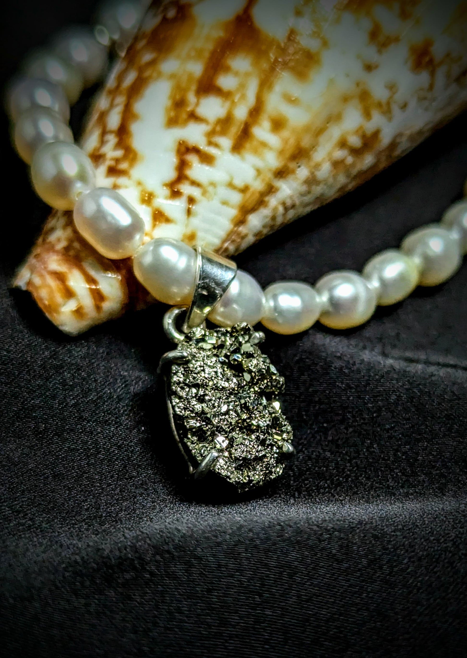 Unique pearl necklace with pyrite pendant featuring beautiful pearls.