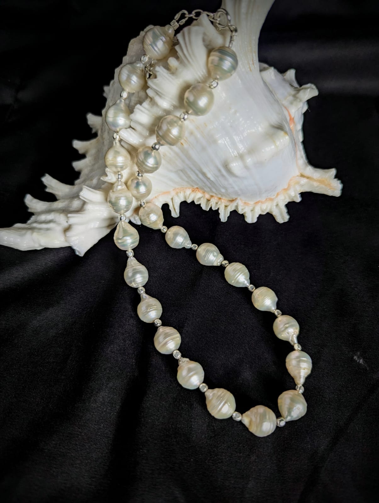 Rare and unique ribbed baroque pearl necklace with silver beads featuring beautiful pearls.